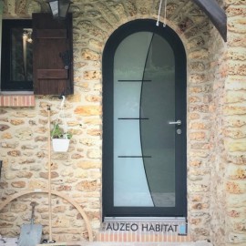 Remplacement complet (dépose totale, pose en applique avec doublage 140 mm) d'une porte d'entrée bois plein plein cintre par une porte d'entrée en mixte bois-aluminium MC France modèle Eden (gamme Eclat), chêne blanchi intérieur - gris RAL 7016 Satiné extérieur avec triple vitrage retardateur d'effraction et serrure 5 pts - Chantier réalisé à Jouars Pontchartrain (78)